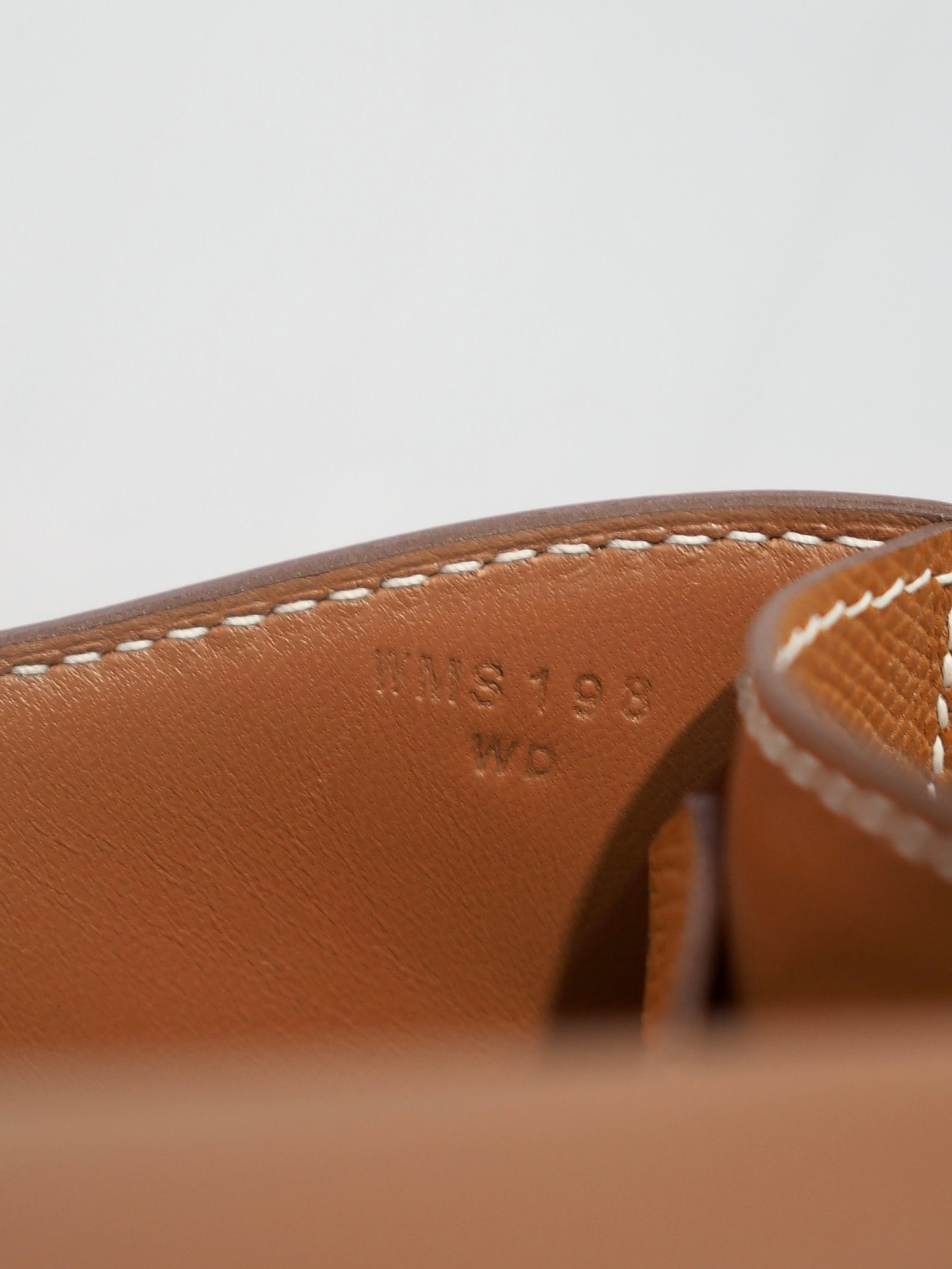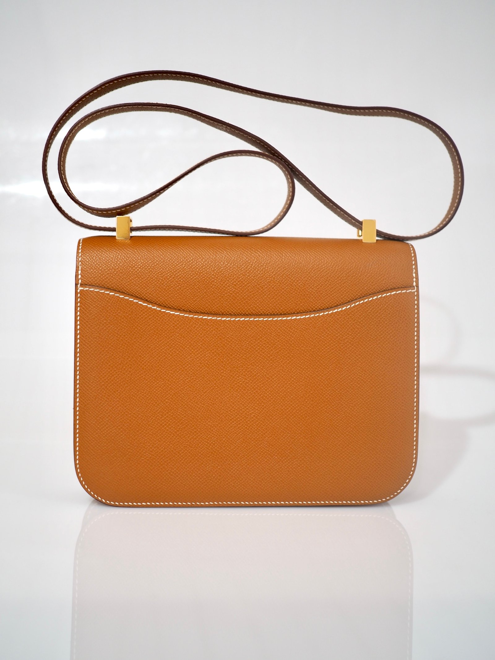 This classic Hermes messenger bag is from 2024 collection. It’s crafted in a structured durable epsom leather in the highly sought-after “gold” shade, paired with gold-plated hardware. Bag features a signature H clasp, long shoulder strap, matching leaning and additional little mirror. This bag has one compartments with a wall pocket and one full size external pocket at the back. The Constance is beloved for its versatility and practicality.