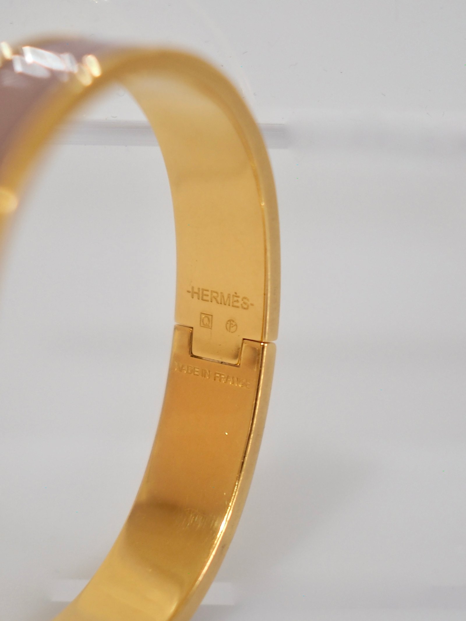 This timeless Hermes accessory crafted in plain old rose enamel and gold plated metal. Bracelet futures the toggle clasp opening. Signed Hermes Paris Made in France, with Q in square stamp at the inner side. Size PM, wrist size 16 cm.